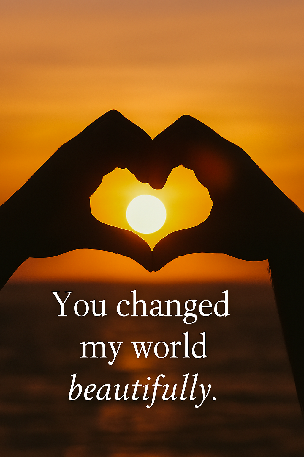 A sunset silhouette of two hands forming a heart — “You changed my world beautifully.”